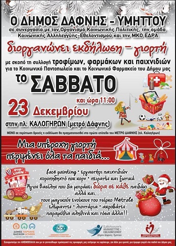 Ο Δήμος Δάφνης – Υμηττού σε συνεργασία με τον Οργανισμό Κοινωνικής Πολιτικής, την ομάδα Κοινωνικής Αλληλεγγύης – Εθελοντισμού και ο κοινωνικός φορέας Κ.Σ.Δ.Ε.Ο. «Έδρα» διοργανώνουν χριστουγεννιάτικη εκδήλωση το Σάββατο 23 Δεκεμβρίου και ώρα 11:00 στην πλατεία Καλογήρων με σκοπό την συλλογή τροφίμων, φαρμάκων και παιχνιδιών για την ενίσχυση του Κοινωνικού Παντοπωλείου και του Κοινωνικού Φαρμακείου.