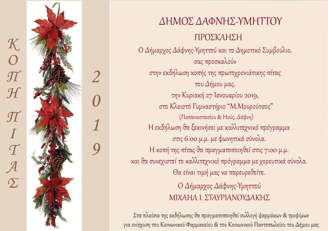 Με μεγάλη χαρά σας προσκαλούμε στην εορταστική εκδήλωση κοπής της χριστουγεννιάτικης πίτας του Δήμου Δάφνης - Υμηττού στο πλαίσιο της οποίας θα πραγματοποιηθεί δράση συλλογής φαρμάκων και τροφίμων με στόχο την ενίσχυση του Κοινωνικού Φαρμακείου και του Κοινωνικού Παντοπωλείου.