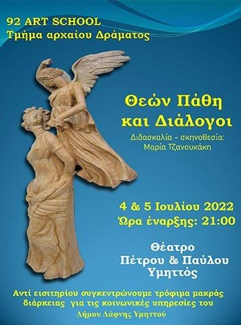 Η θεατρική ομάδα του τμήματος Αρχαίου Θεάτρου του 92 Art School παρουσιάζει μία παράσταση, με αποσπάσματα από τραγωδίες και κωμωδίες, με τίτλο «Αρχαίων Θεών Πάθη και Διάλογοι» υπό τις σκηνοθετικές οδηγίες της Μαρίας Τζανουκάκη.
